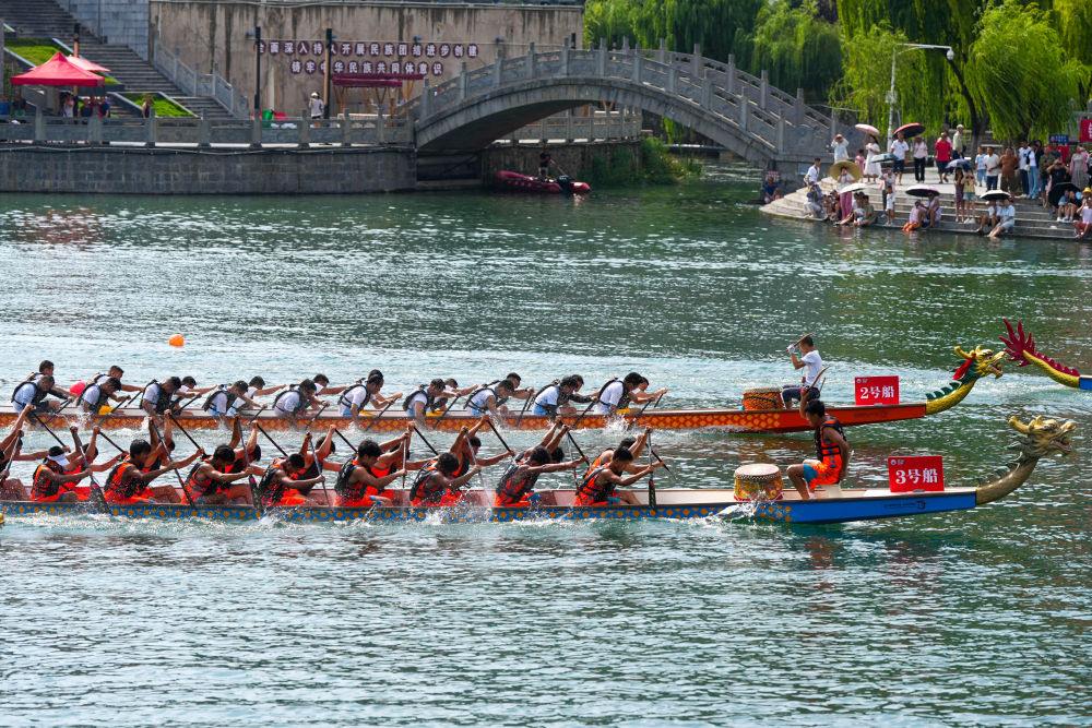 龍舟在本次世運(yùn)會(huì)上首次成為正式比賽項(xiàng)目,這也符合世運(yùn)會(huì)設(shè)項(xiàng)突出地域特色的特點(diǎn)。圖為貴州省黔東南苗族侗族自治州鎮(zhèn)遠(yuǎn)縣?陽(yáng)河上的龍舟比賽。新華社發(fā)(龍建睿攝)