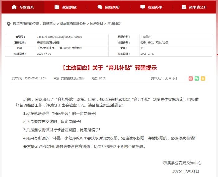 安徽績溪縣公安局7月31日發(fā)布關(guān)于育兒補貼的預警提示。