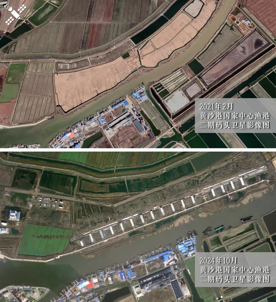解讀:2021年2月施工初期(上圖)對(duì)比2024年10月(下圖),黃沙港國家中心漁港二期工程碼頭主體已建成。