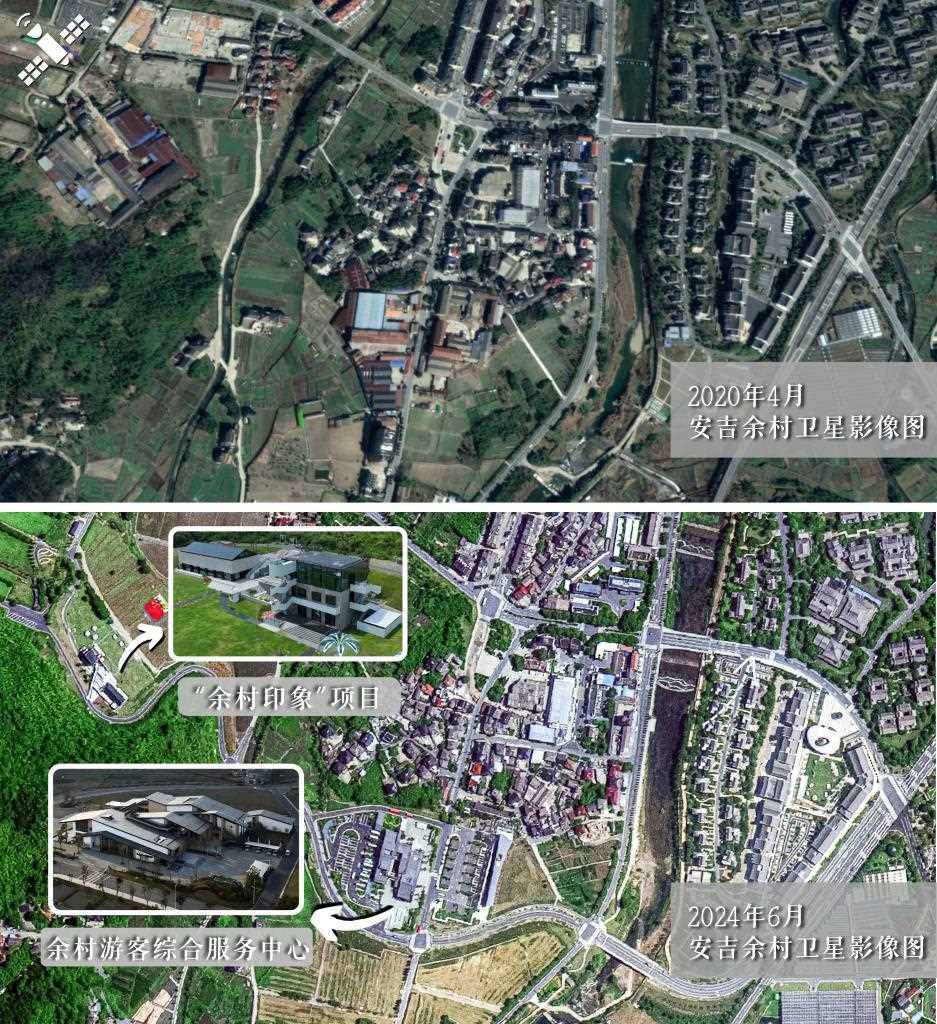 解讀:2020年4月原貌(上圖)對(duì)比2024年6月新貌(下圖),安吉余村將廢棄廠房改造為“余村印象”項(xiàng)目,并建成余村游客綜合服務(wù)中心。