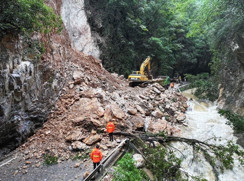 8月10日,在468省道??悼h寺坪鎮(zhèn)升石坪路段,公路養(yǎng)護(hù)部門工作人員駕駛裝載機(jī)處置路旁垮方。