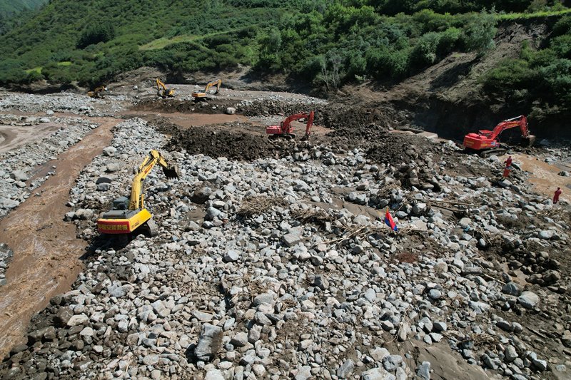8月11日,在榆中縣馬坡鄉(xiāng)陽屲山村,中國安能救援隊使用挖掘機(jī)疏通清理山洪沖下的石頭。