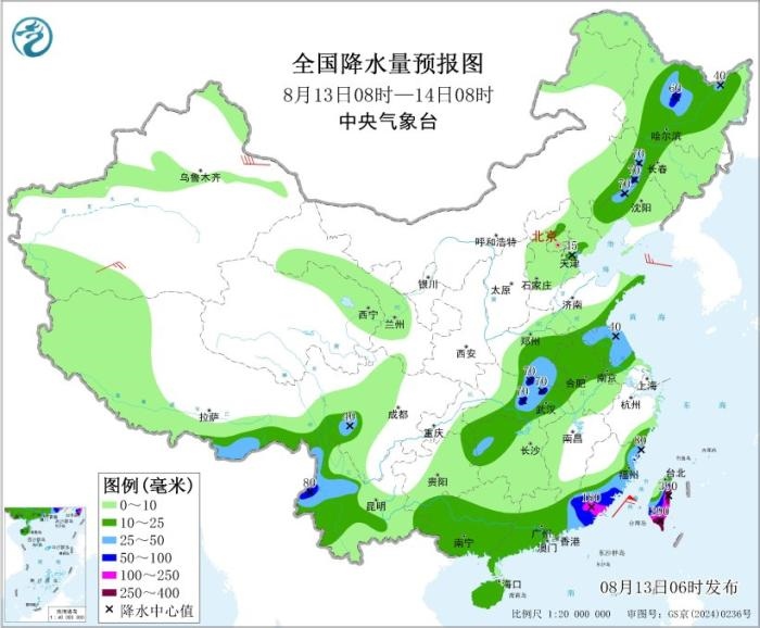 全國降水量預報圖(8月13日08時-14日08時) 圖片來源:中央氣象臺網(wǎng)站