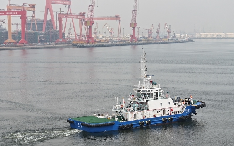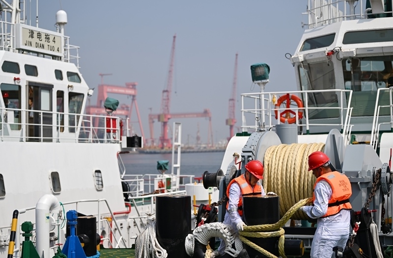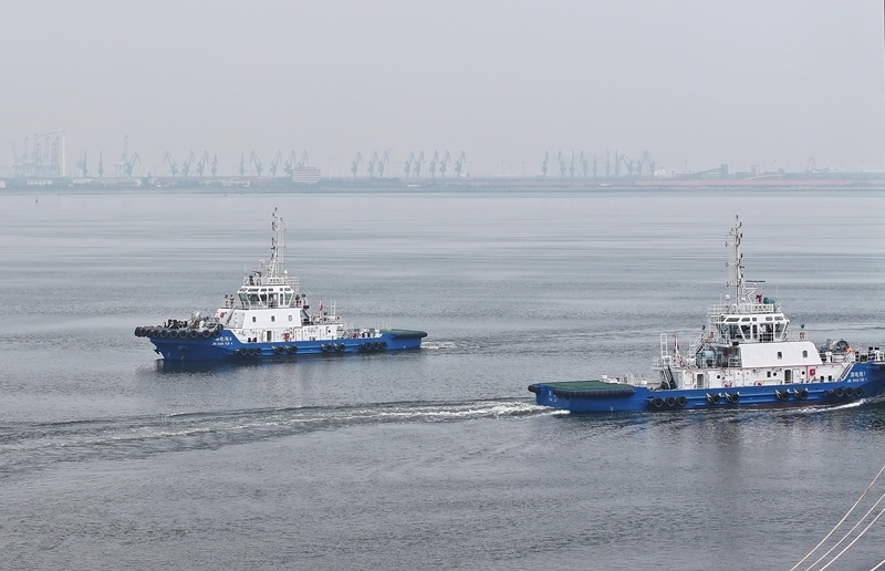 當(dāng)日,由4艘純電動港作拖輪組成的“綠色艦隊(duì)”在中船天津碼頭鳴笛啟航。