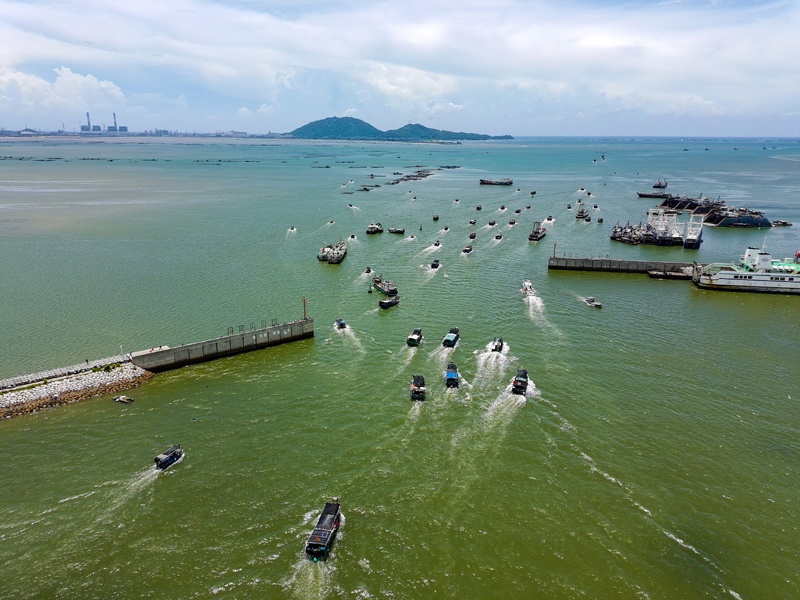8月16日,漁船駛出博賀漁港開始捕撈作業(yè)(無人機照片)。