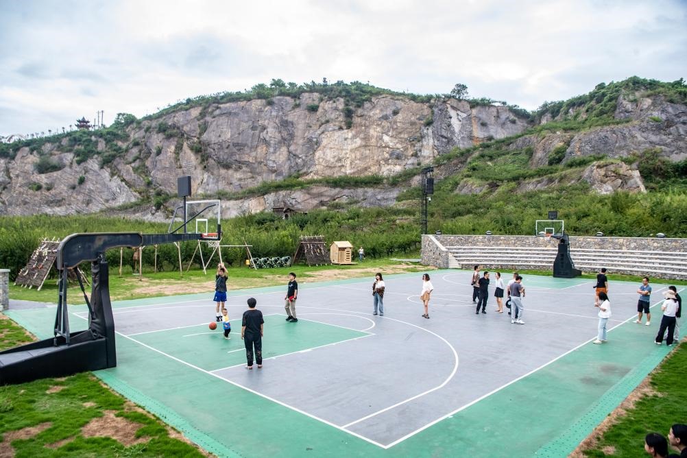 8月16日,在重慶市北碚區(qū)靜觀(guān)鎮(zhèn)中華村,游客在礦坑修復(fù)改造的運(yùn)動(dòng)場(chǎng)內(nèi)打球。新華社記者 唐奕 攝