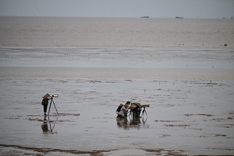 8月25日,攝影愛(ài)好者、鳥(niǎo)類(lèi)保護(hù)者在東臺(tái)條子泥濕地拍攝觀測(cè)鳥(niǎo)類(lèi)。