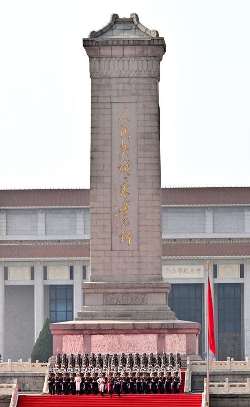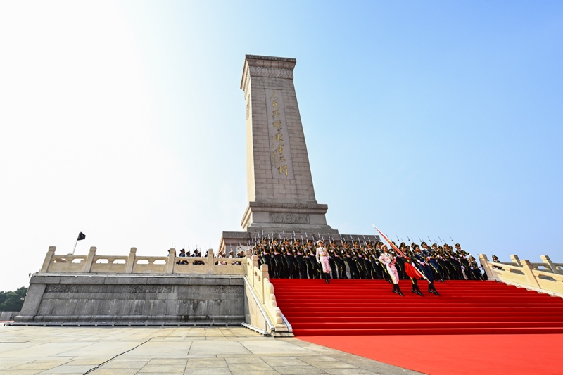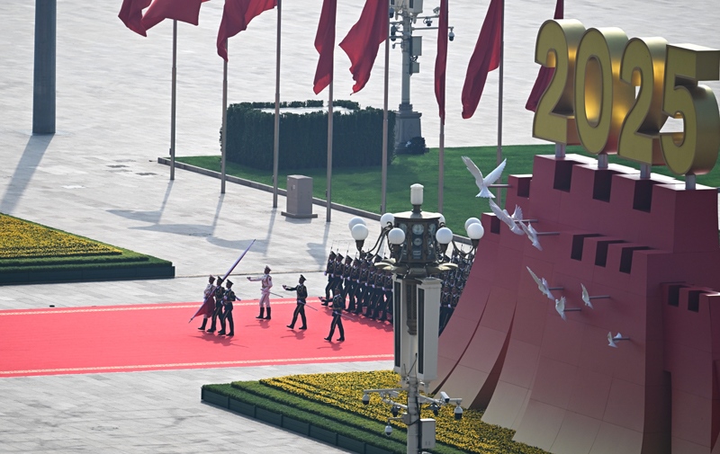 9月3日,紀(jì)念中國人民抗日戰(zhàn)爭暨世界反法西斯戰(zhàn)爭勝利80周年大會在北京隆重舉行。這是國旗護(hù)衛(wèi)隊(duì)從人民英雄紀(jì)念碑基座出發(fā),走向旗桿基座。