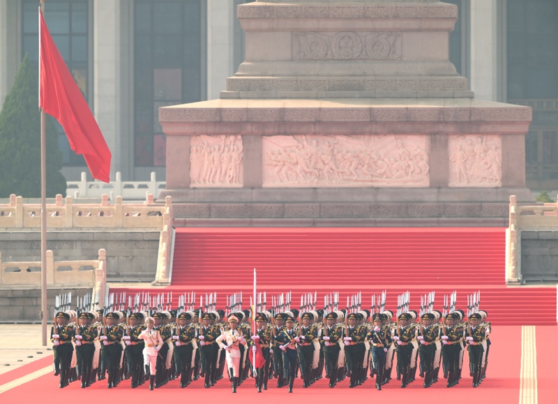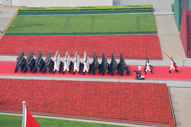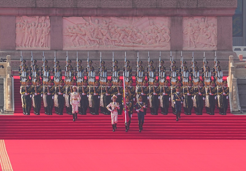 9月3日,紀(jì)念中國人民抗日戰(zhàn)爭暨世界反法西斯戰(zhàn)爭勝利80周年大會在北京隆重舉行。這是國旗護(hù)衛(wèi)隊(duì)從人民英雄紀(jì)念碑基座出發(fā),走向旗桿基座。