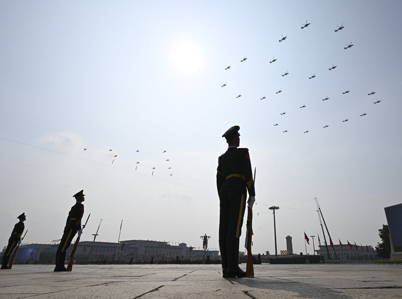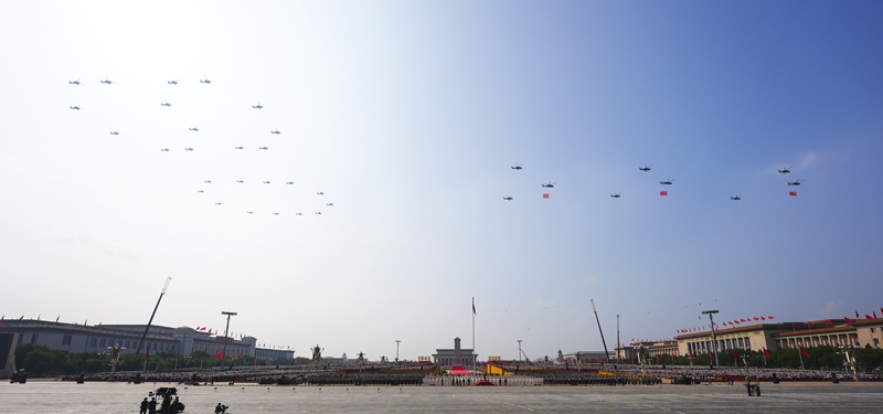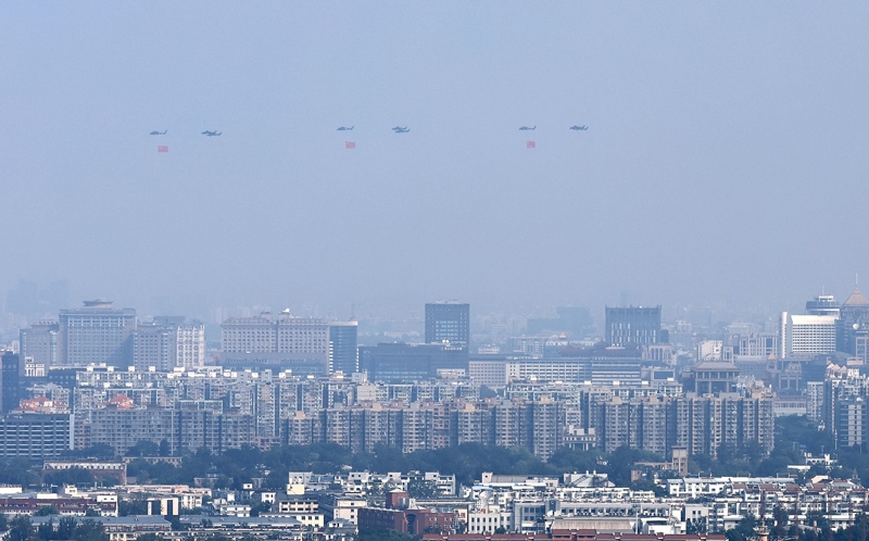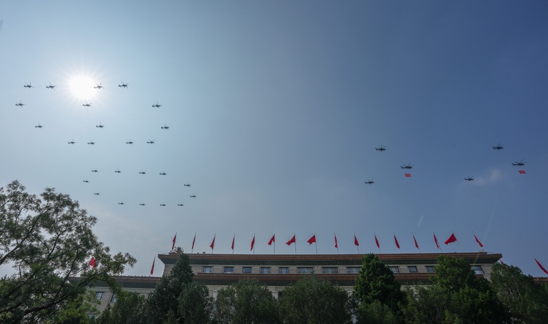 9月3日,紀(jì)念中國人民抗日戰(zhàn)爭暨世界反法西斯戰(zhàn)爭勝利80周年大會(huì)在北京隆重舉行。這是空中護(hù)旗梯隊(duì)飛過天安門廣場上空,26架直升機(jī)匯成巨大的“80”字樣。