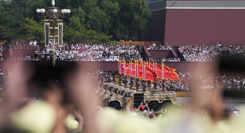 9月3日,紀(jì)念中國人民抗日戰(zhàn)爭暨世界反法西斯戰(zhàn)爭勝利80周年大會(huì)在北京隆重舉行。這是戰(zhàn)旗方隊(duì)通過天安門廣場。