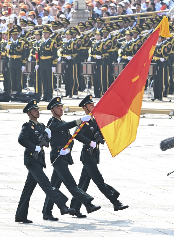 9月3日,紀(jì)念中國(guó)人民抗日戰(zhàn)爭(zhēng)暨世界反法西斯戰(zhàn)爭(zhēng)勝利80周年大會(huì)在北京隆重舉行。這是國(guó)旗護(hù)衛(wèi)隊(duì)在天安門(mén)廣場(chǎng)列隊(duì)。