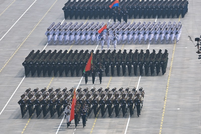 9月3日,紀(jì)念中國人民抗日戰(zhàn)爭暨世界反法西斯戰(zhàn)爭勝利80周年大會在北京隆重舉行。這是徒步方隊(duì)接受檢閱。