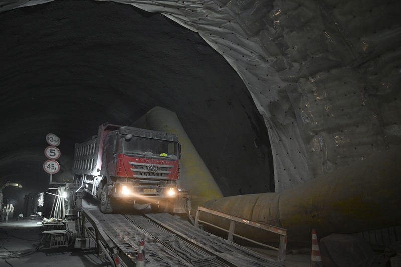 施工車輛行駛在昭溫公路西天山特長隧道右洞內(nèi)(10月5日攝)。