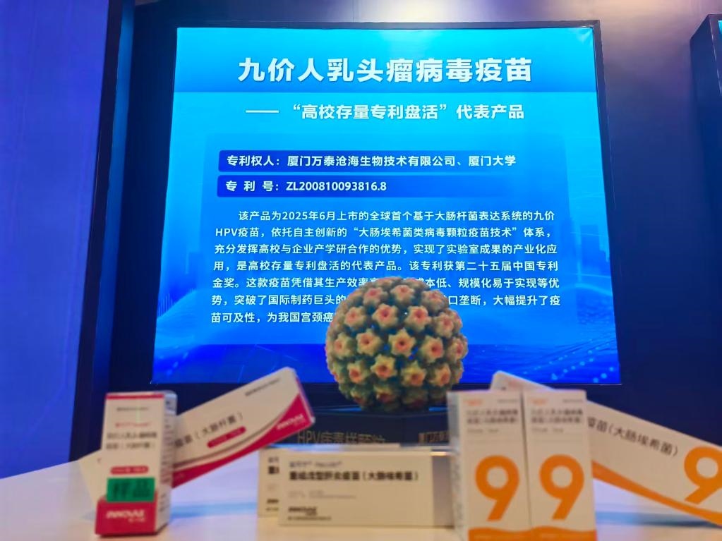 在第十四屆中國(guó)國(guó)際專利技術(shù)與產(chǎn)品交易會(huì)上展出的九價(jià)人乳頭瘤病毒疫苗。新華社記者徐鵬航 攝