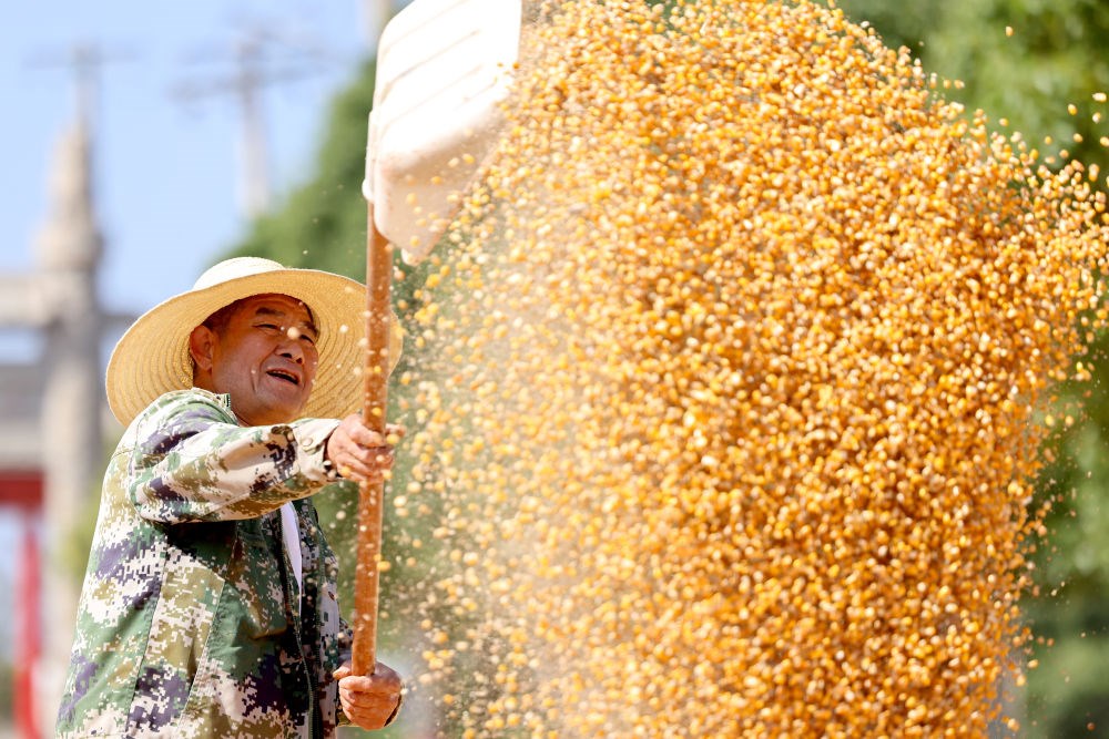 10月16日,山東省棗莊市孟莊鎮(zhèn)劉嶺村農(nóng)民揚曬收獲的玉米。新華社發(fā)(孫中喆 攝)
