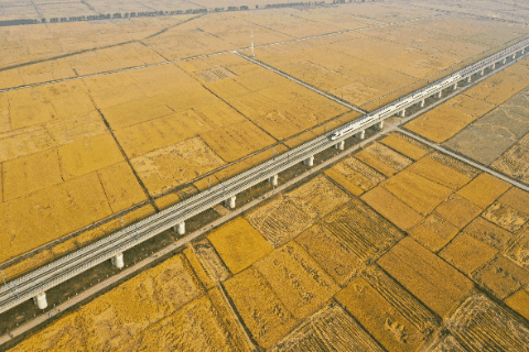 10月14日,在吉林省公主嶺市,一列高鐵列車沿著田間的鐵路線穿行(無人機照片)。2025年,吉林省深化農(nóng)機研發(fā)、制造、推廣、應用一體化試點示范,農(nóng)作物耕種收綜合機械化率達94.6%。新華社記者 張楠 攝