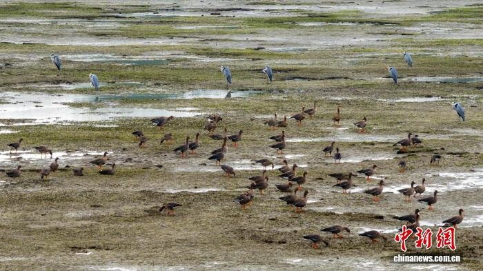 每年10月開始,大批候鳥會隨著冷空氣南下飛抵鄱陽湖越冬。在鄱陽湖湖口劉星咀水域,退水后的灘涂地裸露出來,湖灘上成群越冬候鳥或低空盤旋、或低頭覓食、或交頸私語,悠閑自得,構成一幅動人的生態(tài)畫卷。