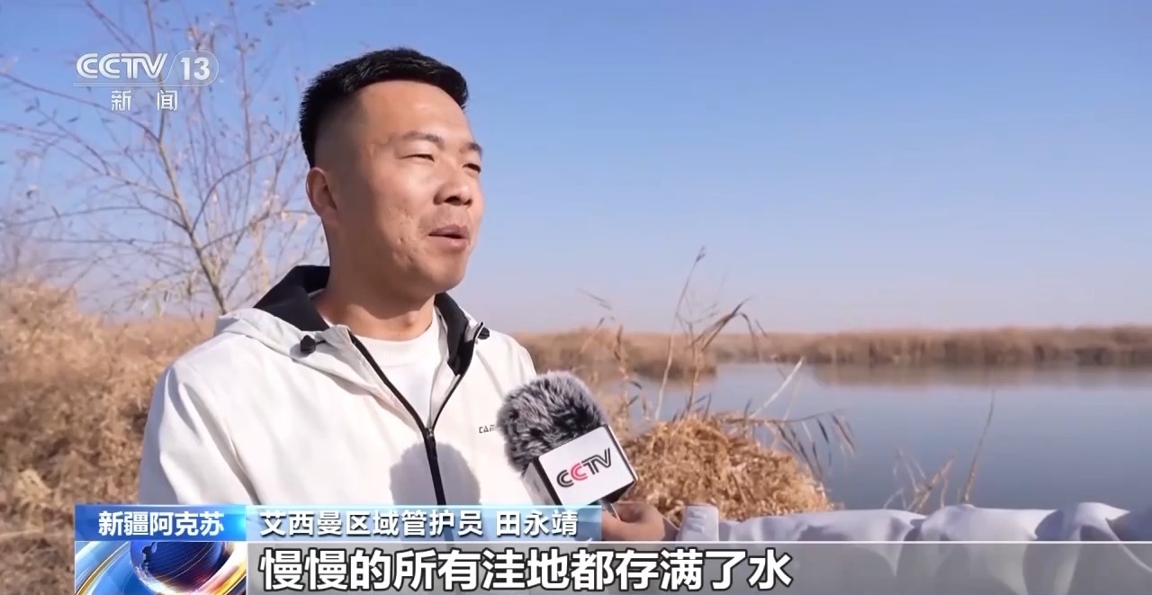艾西曼區(qū)域管護(hù)員 田永靖:再生水過來之后,慢慢所有洼地都存滿了水,變成了現(xiàn)在所看到的濕地,這一大片的蘆葦現(xiàn)在長勢都特別不錯(cuò)。