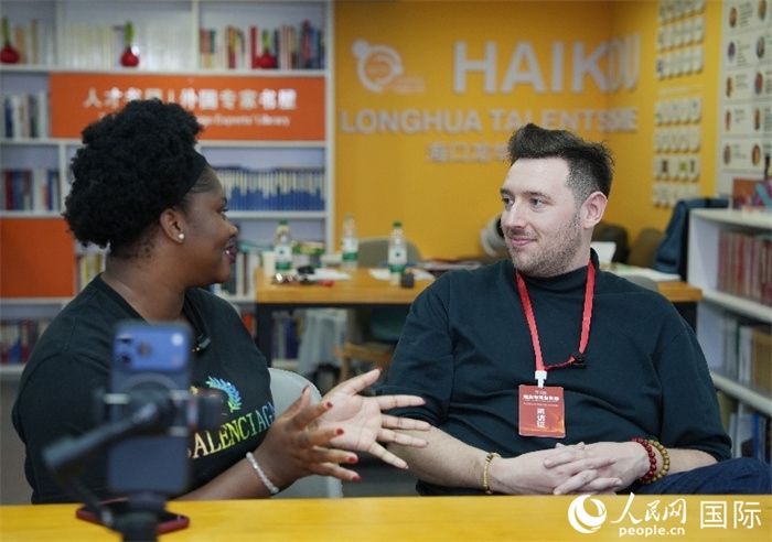 尼日利亞籍創(chuàng)業(yè)者馬爾維斯·烏福馬杜(左一)接受人民網(wǎng)外??旅骺刹稍L。人民網(wǎng)記者 符武平攝