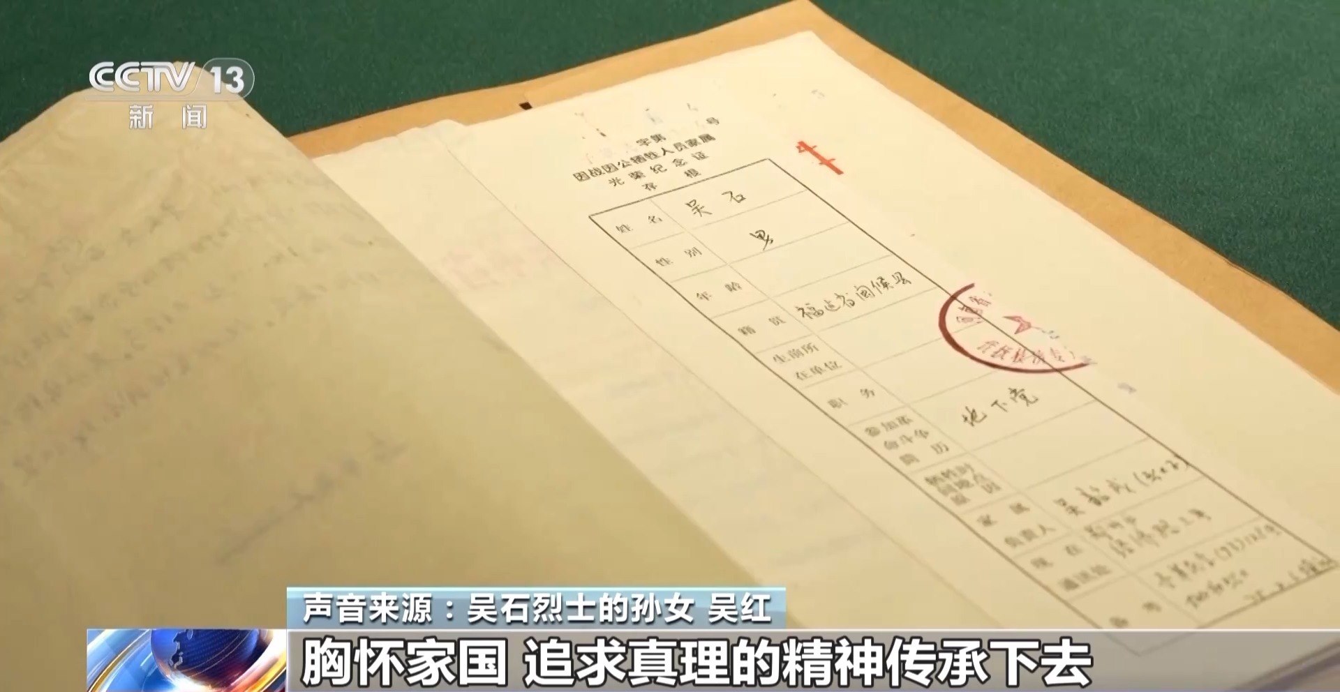 吳石烈士的孫女 吳紅:大家都很敬仰這些先烈們,他們生前留下了這些寶貴資料,我們慢慢地能對(duì)這些先烈們了解更多。傳承這段歷史,讓爺爺和先輩們,包括所有的先烈們的胸懷家國(guó)、追求真理的精神傳承下去。