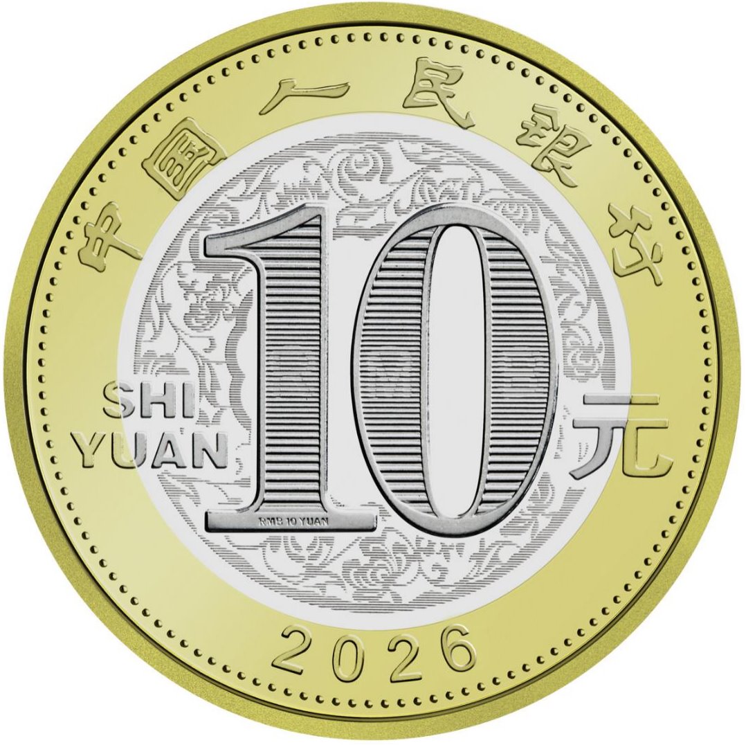 雙色銅合金紀(jì)念幣正面圖案為“中國(guó)人民銀行”、“10元”字樣,漢語拼音字母“SHIYUAN”及年號(hào)“2026”,底紋襯以團(tuán)花圖案。