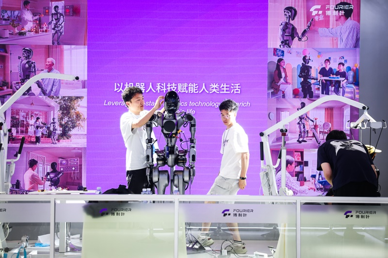 2025世界人工智能大會(huì)上,傅利葉工程師調(diào)試人形機(jī)器人。解放日?qǐng)?bào)記者 海沙爾 攝