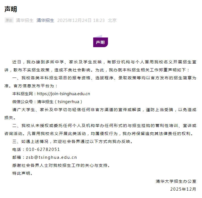 據“清華招生”微信公眾號消息,清華大學招生辦公室24日發(fā)布聲明稱,近日,清華大學招生辦公室接到多所中學、家長及學生反映,有部分機構與個人冒用清華大學名義開展招生宣講,散布不實招生政策,造成不良社會影響。為此,清華大學招生辦公室就本科招生相關工作鄭重聲明如下: