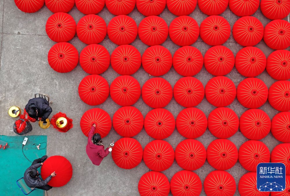 ↑ 1月21日,在浙江省臺(tái)州市仙居縣橫溪鎮(zhèn)一家燈籠加工作坊,工人趕制大紅燈籠(無(wú)人機(jī)照片)。新華社發(fā)(王華斌攝)