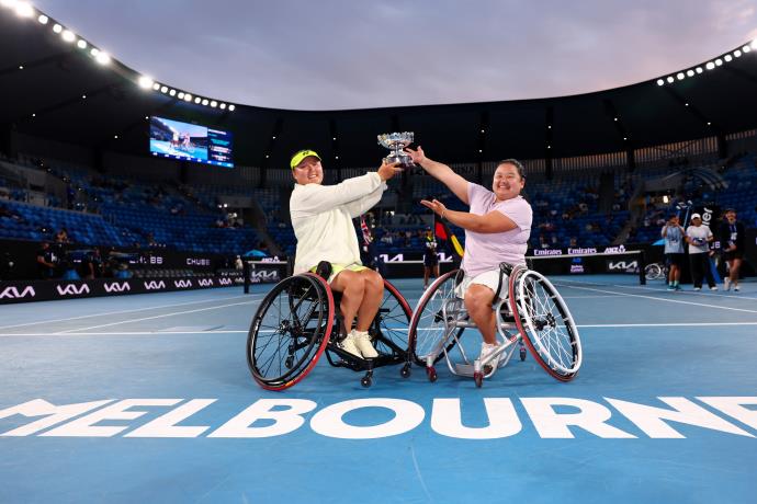 北京時間1月30日,2026澳網輪椅網球女雙決賽,頭號種子、中國組合王紫瑩/李曉輝以6-4、6-3擊敗2號種子朱珍珍/上地結衣,實現(xiàn)衛(wèi)冕。中國選手朱珍珍和搭檔上地結衣收獲亞軍。
