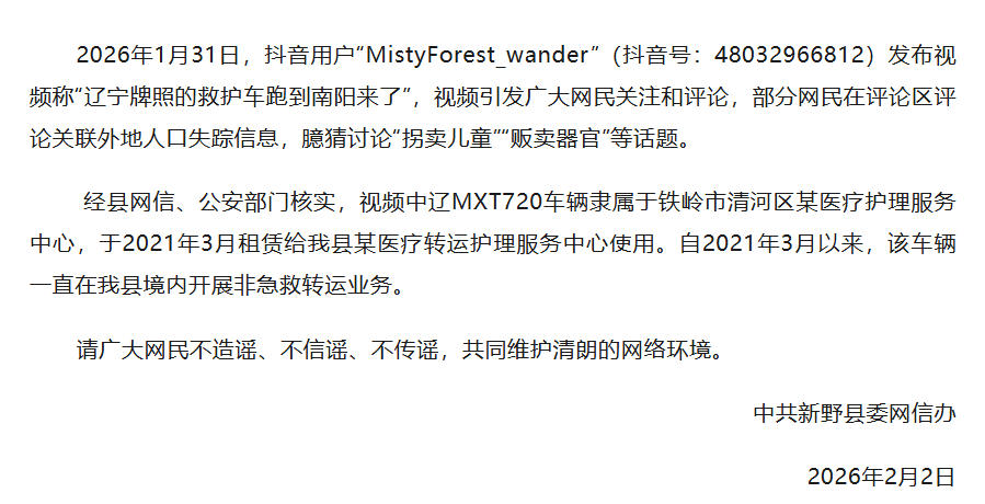 中國網(wǎng)2月2日訊 據(jù)“新野發(fā)布”微信公眾號消息,2月2日上午,河南省南陽市新野縣委網(wǎng)信辦發(fā)布情況說明稱,2026年1月31日,抖音用戶“MistyForest_wander”(抖音號:48032966812)發(fā)布視頻稱“遼寧牌照的救護(hù)車跑到南陽來了”,視頻引發(fā)廣大網(wǎng)民關(guān)注和評論,部分網(wǎng)民在評論區(qū)評論關(guān)聯(lián)外地人口失蹤信息,臆猜討論“拐賣兒童”“販賣器官”等話題。