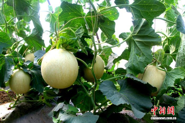 圖為原本伏地生長的臺灣“玉菇”甜瓜,落戶民勤變成了吊瓜。馬愛彬 攝