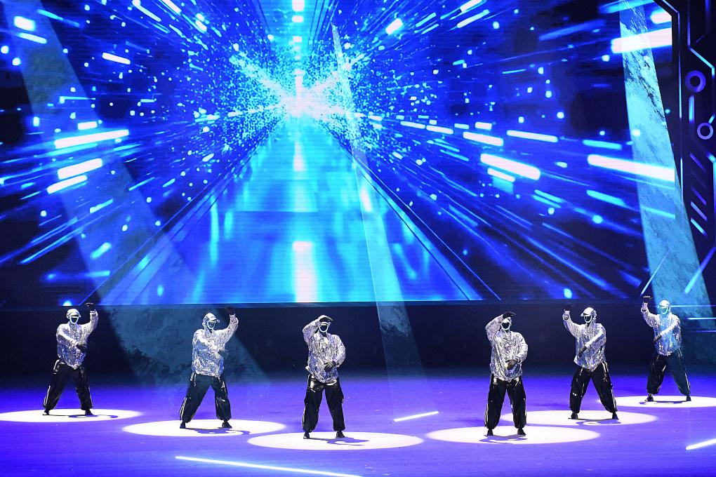 在開場節(jié)目《萬馬奔騰》中,20臺機(jī)械臂與26臺雙臂機(jī)器人齊揮鼓槌,激昂鼓聲奏出奮進(jìn)節(jié)拍。