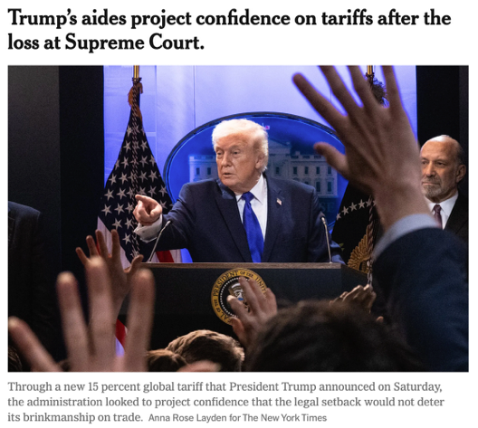 △《紐約時報》報道,特朗普政府當?shù)貢r間22日表示,新的征稅方法將以更合法、更持久的方式實現(xiàn)美國的貿易目標