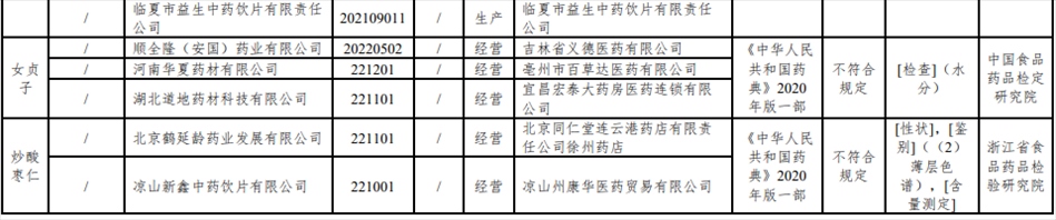 經(jīng)浙江省食品藥品檢驗研究院檢驗,標示為北京鶴延齡藥業(yè)發(fā)展有限公司、涼山新鑫中藥飲片有限公司生產(chǎn)的2批次炒酸棗仁不符合規(guī)定,不符合規(guī)定項目包括性狀、鑒別、含量測定。