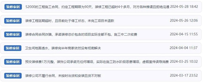 其實(shí),有著同樣遭遇的消費(fèi)者不在少數(shù)。公開(kāi)報(bào)道顯示,今年以來(lái)有多個(gè)家裝機(jī)構(gòu)分公司或經(jīng)銷(xiāo)商跑路,還有個(gè)別不良裝修公司在短時(shí)間內(nèi)聚收大量預(yù)付款后攜款跑路,給消費(fèi)者帶來(lái)經(jīng)濟(jì)財(cái)產(chǎn)損失。“人民投訴”梳理發(fā)現(xiàn),除閉店跑路外,目前平臺(tái)上涉及家裝消費(fèi)類(lèi)的投訴問(wèn)題多聚焦于——