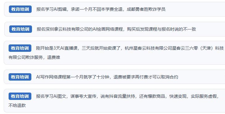然而,“人民投訴”經(jīng)梳理發(fā)現(xiàn),網(wǎng)絡(luò)上不少消費者吐槽相關(guān)課程質(zhì)量良莠不齊,與廣告承諾“免費領(lǐng)取AI應(yīng)用體驗課及AI工具”“低投入、高回報”“副業(yè)賺錢”“快速變現(xiàn)”等內(nèi)容大相徑庭。相關(guān)商家虛假宣傳、誘導(dǎo)消費、貨不對板以及退費難等問題被反復(fù)提及。