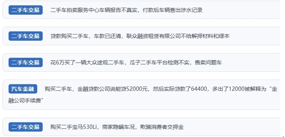 車輛報告弄虛作假,如私自篡改修車記錄、涉水記錄、里程記錄、保險信息、違章信息等,消費者付款后車輛到手使用時方才知曉;商家魚目混珠、以次充好,刻意隱瞞車輛來源,運營車充當非運營車輛賣,涉案車輛充當正常車輛賣;訂金、押金、保證金隨意收,取消交易后商家拒不退還;交易合同陷阱多,發(fā)票真假難辨,車輛售后維修服務難保障;實際貸款數(shù)額與申請額度不符、手續(xù)費多少不明了、提前還款收取高額違約金,金融貸款“陷阱”防不勝防……
