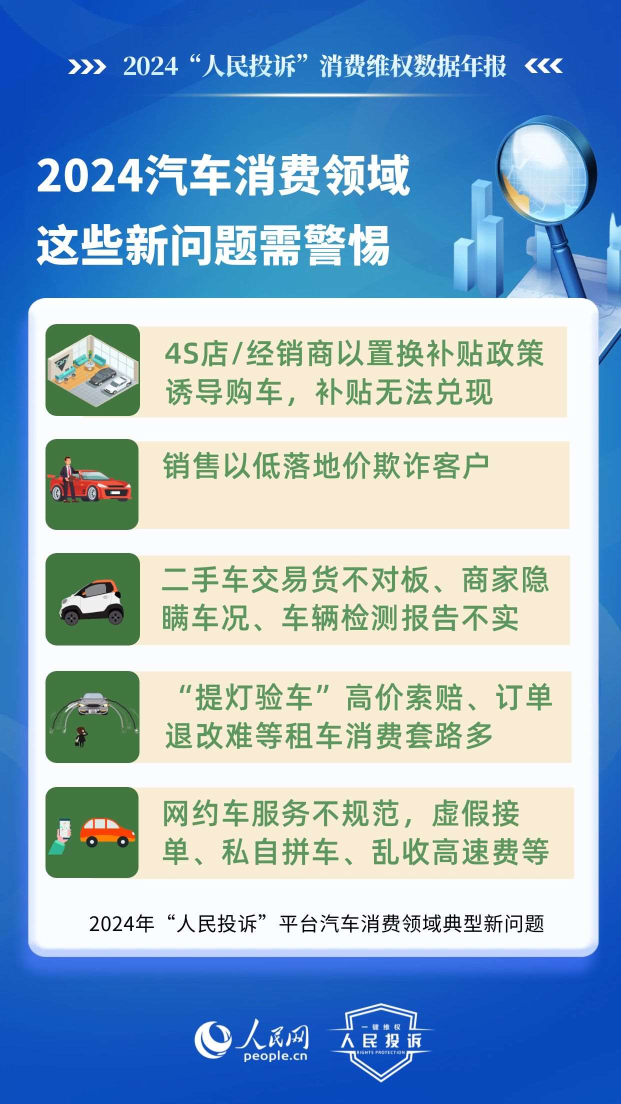 新問(wèn)題體現(xiàn)在:4S店/經(jīng)銷(xiāo)商以置換補(bǔ)貼政策誘導(dǎo)購(gòu)車(chē),結(jié)果補(bǔ)貼無(wú)法兌現(xiàn);銷(xiāo)售以低落地價(jià)欺詐客戶(hù);二手車(chē)交易貨不對(duì)板、商家隱瞞車(chē)況、平臺(tái)車(chē)輛檢測(cè)報(bào)告不實(shí);惡意租“故障車(chē)”、“提燈驗(yàn)車(chē)”高價(jià)索賠、低價(jià)誘租、訂單退改難等租車(chē)消費(fèi)套路多;網(wǎng)約車(chē)服務(wù)不規(guī)范,人車(chē)不符、虛假接單、私自拼車(chē)、亂收高速費(fèi)等。