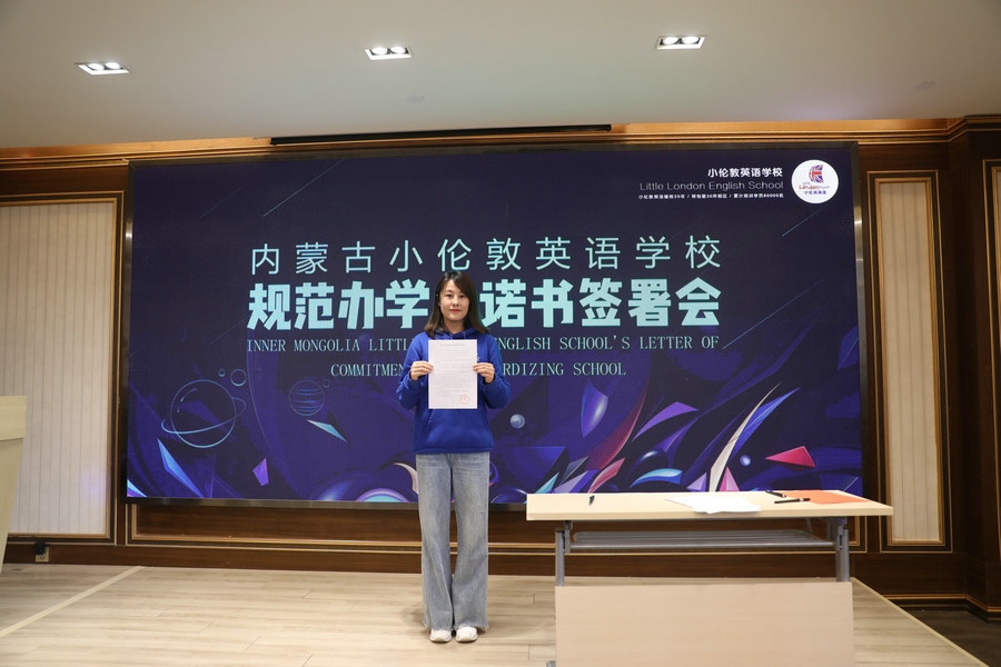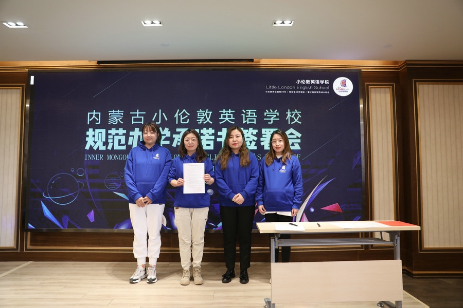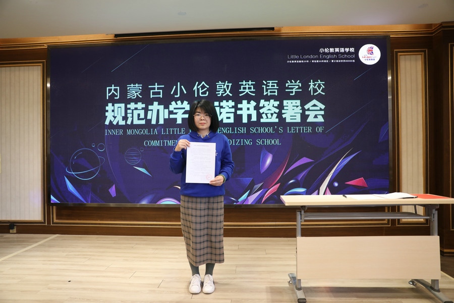 “堅(jiān)持黨的領(lǐng)導(dǎo),堅(jiān)持社會(huì)主義辦學(xué)方向,持證辦學(xué),依法辦學(xué)。以興趣培養(yǎng)為目標(biāo),推動(dòng)國(guó)際化人才的培養(yǎng)。堅(jiān)決推進(jìn)“減負(fù)”,不擅自提升學(xué)費(fèi),不在法定節(jié)假日安排授課。招生宣傳真實(shí)可信,杜絕夸大宣傳、虛假承諾、捆綁誘導(dǎo)、隱瞞欺詐等方式誤導(dǎo)學(xué)生及家長(zhǎng)的行為……”簽署會(huì)現(xiàn)場(chǎng),內(nèi)蒙古小倫敦英語(yǔ)學(xué)校副校長(zhǎng)尚燕云宣讀《內(nèi)蒙古小倫敦英語(yǔ)學(xué)校規(guī)范辦學(xué)承諾書》。