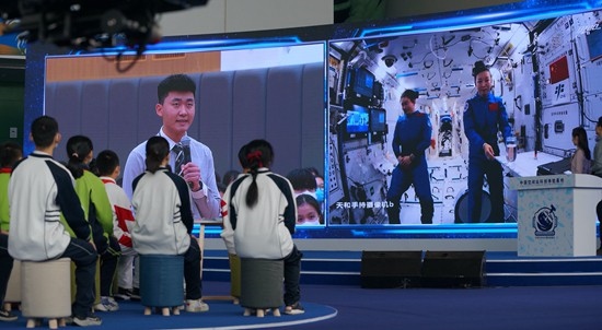 12月9日,中國(guó)空間站“天宮課堂”第一課正式開(kāi)講,此次授課活動(dòng)在中國(guó)科技館設(shè)地面主課堂,在廣西南寧、四川汶川、香港、澳門(mén)分設(shè)4個(gè)地面分課堂,共1420名中小學(xué)生代表參加現(xiàn)場(chǎng)活動(dòng)。圖為青少年向航天員提問(wèn)。中國(guó)科技館供圖