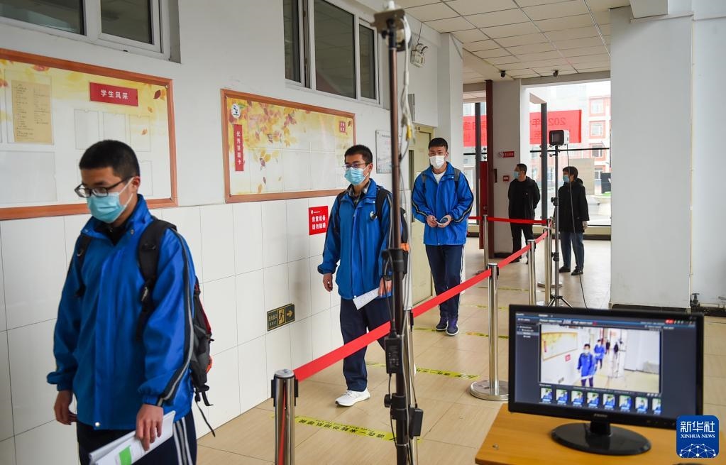 4月1日,高三年級學生走進呼和浩特市鐵路第二中學教學樓,體溫檢測設(shè)備查驗學生體溫。