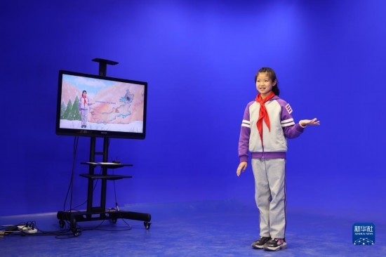 3月23日,一名學(xué)生在內(nèi)蒙古自治區(qū)氣象局天氣預(yù)報(bào)演播室內(nèi)體驗(yàn)演播過(guò)程。