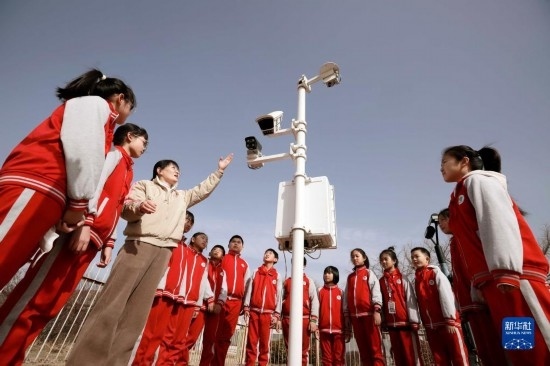 3月23日,在河北省遵化市氣象臺(tái),工作人員為小學(xué)生介紹氣象觀測(cè)知識(shí)。