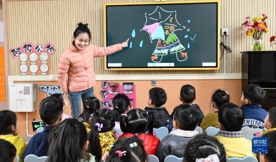 3月23日,河南省濟(jì)源市愚公路幼兒園的老師在課堂上為小朋友們講解雨水的形成過(guò)程。