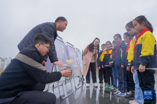 3月23日,工作人員在貴州省銅仁市玉屏侗族自治縣氣象局為小朋友介紹氣象知識(shí)。