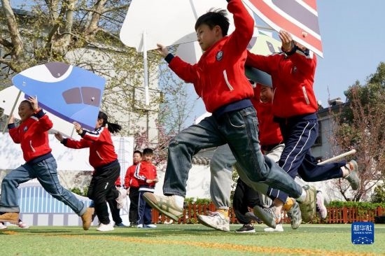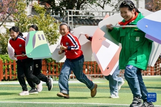 3月31日,徐州市漢橋小學的學生進行“列車競速”游戲。