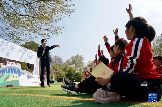 3月31日,徐州市漢橋小學的學生在鐵路安全知識講解中舉手回答互動問題。