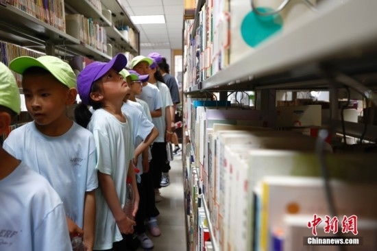 圖為一個藏族女孩抬頭望向書架。 中新社記者 富田 攝