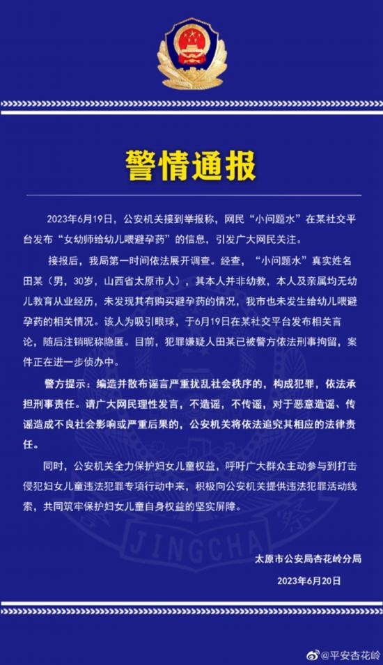 20日,@平安杏花嶺 發(fā)布警情通報稱,經(jīng)查,“小問題水”真實姓名田某(男,30歲,山西省太原市人),其本人并非幼教,本人及親屬均無幼兒教育從業(yè)經(jīng)歷,未發(fā)現(xiàn)其有購買避孕藥的情況,我市也未發(fā)生給幼兒喂避孕藥的相關(guān)情況。